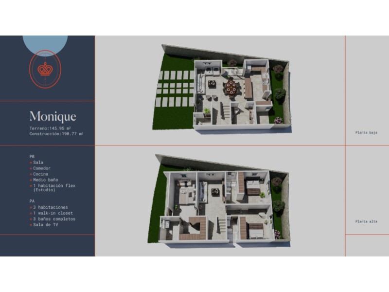 MODELO MONIQUE. Hermosa casa muy amplia cuenta con: PB ๏ Sala ๏ Comedor ๏ Cocina ๏ Medio baño ๏ 1 habitación flex (Estudio) PA ๏ 3 habitaciones ๏ 1 walk-in closet ๏ 3 baños completos ๏ Sala de TV #ref:CAS_180_C