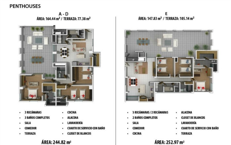 Folio: (1402) Precio (obra blanca) $3,736,500.00 Precio con acabados (sin cocina, ni closets) $3,846,500.00 CARACTERISTICAS PRINCIPALES • 20 Departamentos de 120.00 m2 de construcción. • 10 Departamentos de 130.00 m2 de construcción. • 2 Penthouses de 242.00 m2 con terrazas privadas de 70.00 m2. • 1 Penthouse de 253 m2 con terraza privada de 100 m2. • 5 Departamentos por piso en 2 torres con 7 niveles. • 2 Cajones de Estacionamiento techados por departamento. • 2 elevadores de alta velocidad. • Caseta de Vigilancia. • Cámaras de monitoreo y vigilancia 24/7. • Barda perimetral de mas de 3 metros de altura • Alberca con terraza y jardín. • Salón Polivalente • Áreas verdes • Cuarto de Servicio • 36 CAJONES DE ESTACIONAMIENTO EN NIVEL DE SÓTANO • CISTERNA 50,000 LTS DISTRIBUCIONES: • 2 y 3 Recámaras o 2 recámaras y estancia familiar. • Vestidores en recamara principal • Closets en recamaras secundarias • 2 Baños completos muy amplios. • Cuarto de blancos • Sala y Comedor • Terraza por departamento • Cocina con Alacena • Lavandería techada y cerrada • Cuarto de servicio con baño completo • Cuarto de maquinas para instalación de minisplits. • Zinc exterior. LOS DEPARTAMENTO SE ENTREGAN EN OBRA BLANCA: (Puerta principal, Yeso muestreado o similar en paredes y cielos, plafond, pintura general, contactos y apagadores). No incluye: pisos, puertas, closets, cocina, muebles de baño. Se ofrecerán diferentes alcances en paquetes de acabados con cargo al cliente y que podrán incluir desde solo la colocación del piso de porcelanato, hasta la entrega de los departamentos terminados, amueblados y decorados. Departamentos A - B - C - D ÁREA: 119.14 m2 • 2 RECÁMARAS • 2 BAÑOS COMPLETOS • SALA • COMEDOR • COCINA • ALACENA • CLOSET DE BLANCOS • LAVANDERÍA • CUARTO DE SERVICIO CON BAÑO • BALCÓN Departamentos E - F • 3 RECÁMARAS • 2 BAÑOS COMPLETOS • SALA • COMEDOR • COCINA • ALACENA • CLOSET DE BLANCOS • LAVANDERÍA • CUARTO DE SERVICIO CON BAÑO • BALCÓN ÁREA: 129.64 m2 _________________________ VIVE VERTICAL- Contáctanos, con gusto te atenderá uno de nuestros asesores especializados en departamentos. Tel. 8218-9330 /31 info@vivevertical.com http:///www.vivevertical.com.