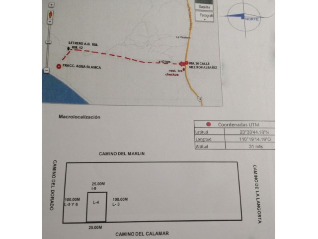 Lote rústico en venta con 25 metros de frente por 100 metros de fondo en Agua Blanca de Macías, en el complejo turístico Club Campestre El Carrizal, este terreno se localiza a 300 Metros de la playa. El terreno es ideal para construir la casa de playa de tus sueños, disfruta de sus hermosas playas y avistamiento de ballenas desde este paradisiaco lugar del Pacifico ó bien invierte en un negocio potencializando su belleza natural de su hermosa playa, aislamiento, dunas y el fuerte oleaje, dale un plus a tu inversión. Puedes llegar a él, en poco minutos desde Todos Santos actualmente declarado Pueblo Mágico y carretera de la Paz. Superficie: 2,500M2 ¡Toda la documentación se encuentra en orden!. #ref:TER_111