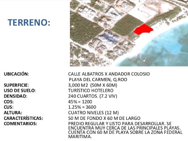 SUPERFICIE: 3,000 M2 (50M X 60M) USO DE SUELO: TUR?STICO HOTELERO DENSIDAD: 240 CUARTOS. (7.2 VIV) COS: 45% = 1200 CUS: 1.25% = 3600 ALTURA: CUATRO NIVELES (12 M) CARACTER?STICAS: 50 M DE FONDO X 60 M DE LARGO COMENTARIOS: PREDIO REGULAR Y LISTO PARA DESARROLLAR. SE ENCUENTRA MUY CERCA DE LAS PRINCIPALES PLAYAS. CUENTA CON 60 M DE PLAYA SOBRE LA ZONA FEDERAL MARITIMA. #ref:LOTPLAHOT003